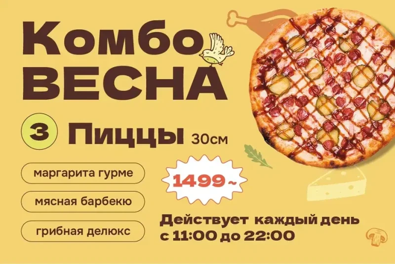 3 пиццы "Мясное барбекю", "Маргарита гурме", "Грибная делюкс" диаметром 30см за 1499руб.