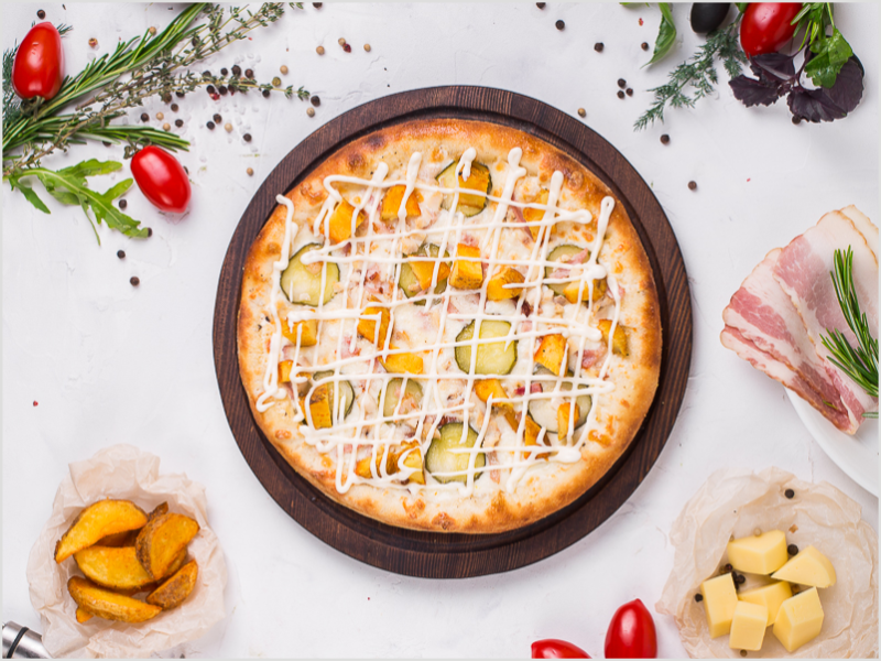 Бекон, курица, картофель Айдахо, огурчик маринованный, сыр Моцарелла, соус Сливочный, соус Майонезный