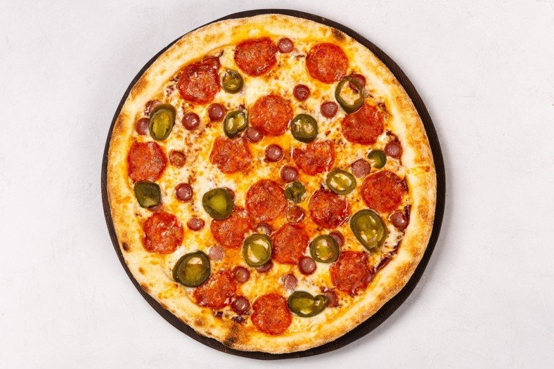 Пепперони, охотничьи колбаски, острый перчик «Халапеньо», сыр Моцарелла, соус Барбекю