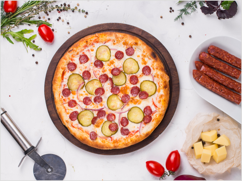 Охотничьи колбаски, огурцы маринованные, красный лук, сыр Моцарелла, соус Томатный